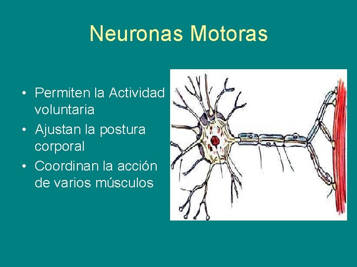 Neurona motoras: conducen impulsos desde el SNC hasta el músculo liso, el músculo cardíaco y las glándulas. El control es voluntario.